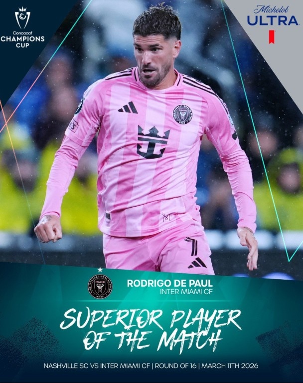美冠杯八分之一决赛首回合,迈阿密国际客场0-0战平纳什维尔。德保罗全场比赛108次触球、95次传球,贡献2次抢断,此外9次对抗成功6次,获评7.6分,他被赛事官方评选为本场比赛最佳球员。