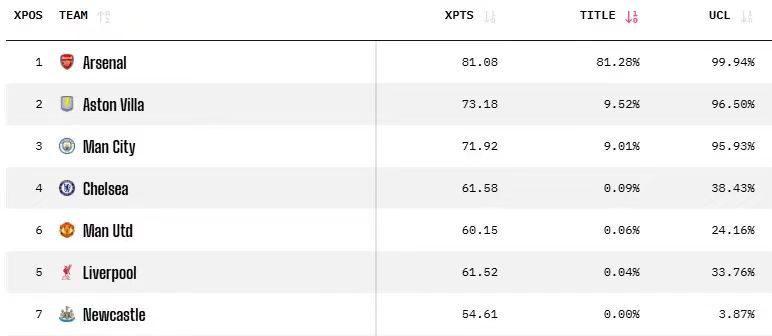 当然,虽然外界对于阿森纳目前的境遇都感到悲观,但毫无疑问AI对于阿森纳本赛季夺冠的前景还是非常看好的,据知名数据网站Opta预测,英超联赛23轮比赛结束后,英超夺冠的概率中,阿森纳依旧以81.28%概率断崖式的排在第一位,而排在第二位的阿斯顿维拉,仅仅只有9.52%的概率,而曼城则只有9.01%的概率。所以,阿森纳球员和球迷真的没必要过于悲观,毕竟目前主动权还在自己手中。